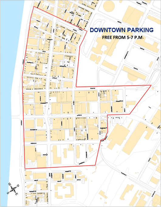 On-street parking is FREE in the Downtown Improvement District from 5 – 7 PM. For more information on this program, refer to the map for details.